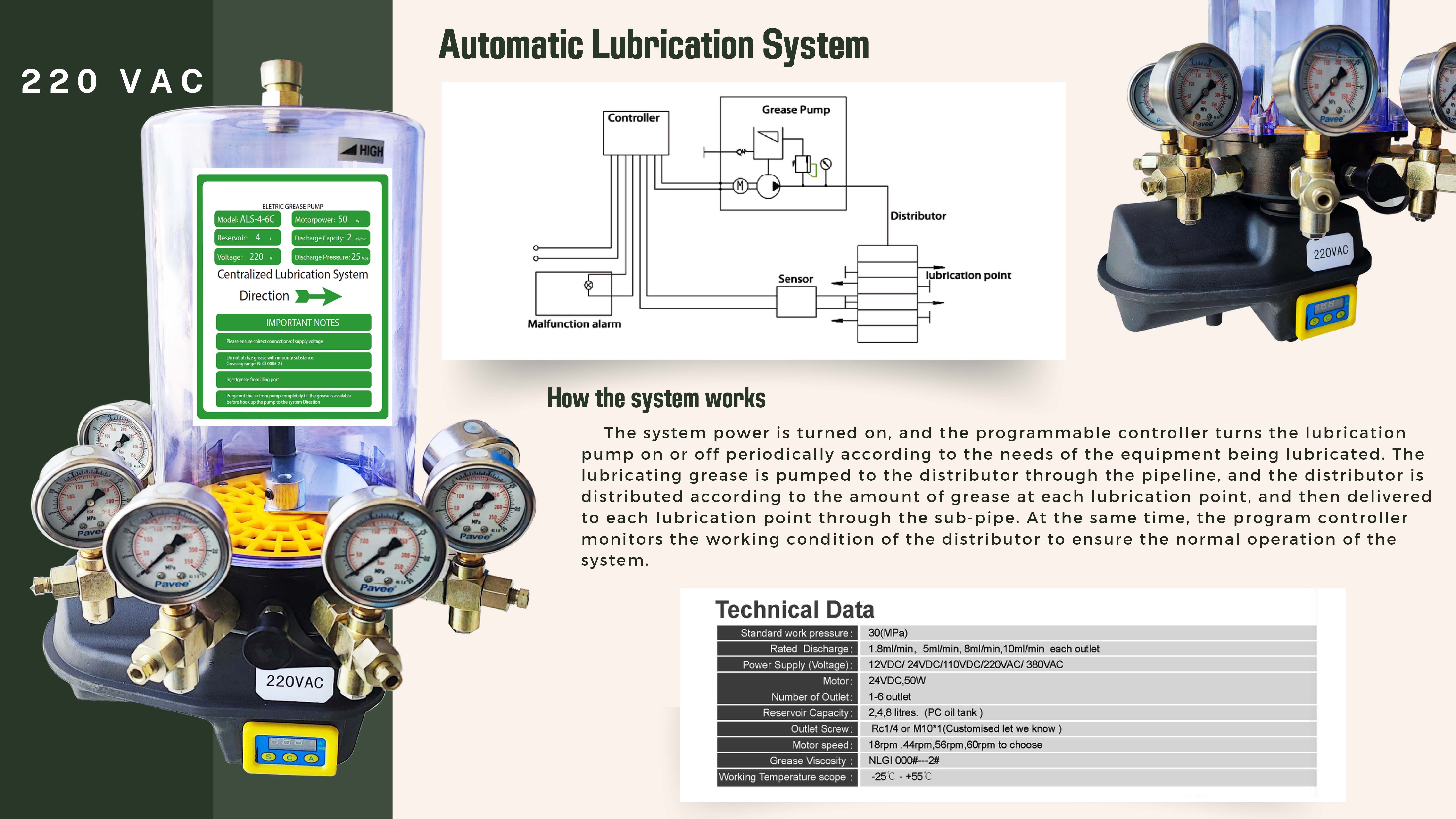 System Composition The progressive centralized lubrication system is mainly composed of a lubrication pump, a progressive distributor, a control device, " pipeline "nd" pipe joint.