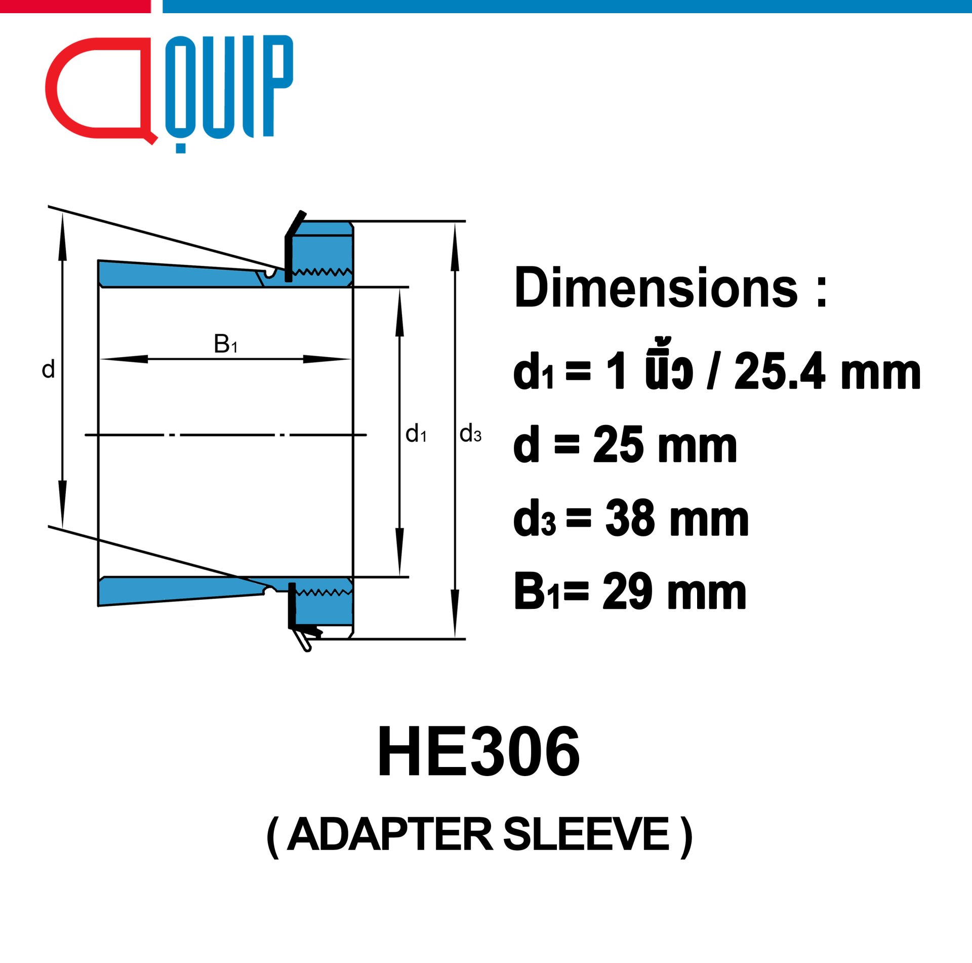 ปลอกรัดเพลา เบอร์ HE306ADAPTER SLEEVE ปลอกรัดเพลา สำหรับเพลานิ้วSpecifications d1 = 1" หรือ 25.4 mm d = 30 mm d3 = 45 mm B1 = 31 mm