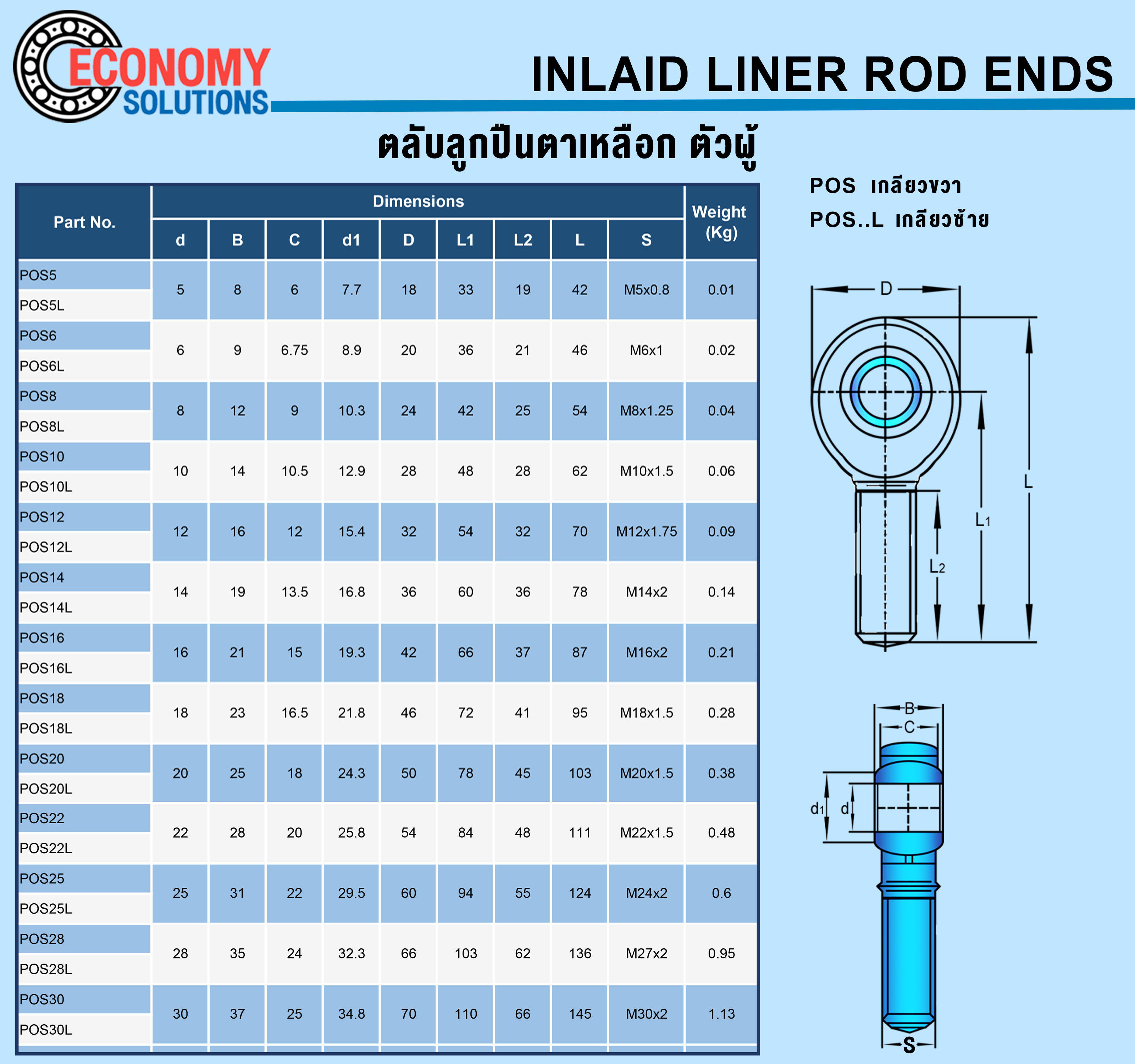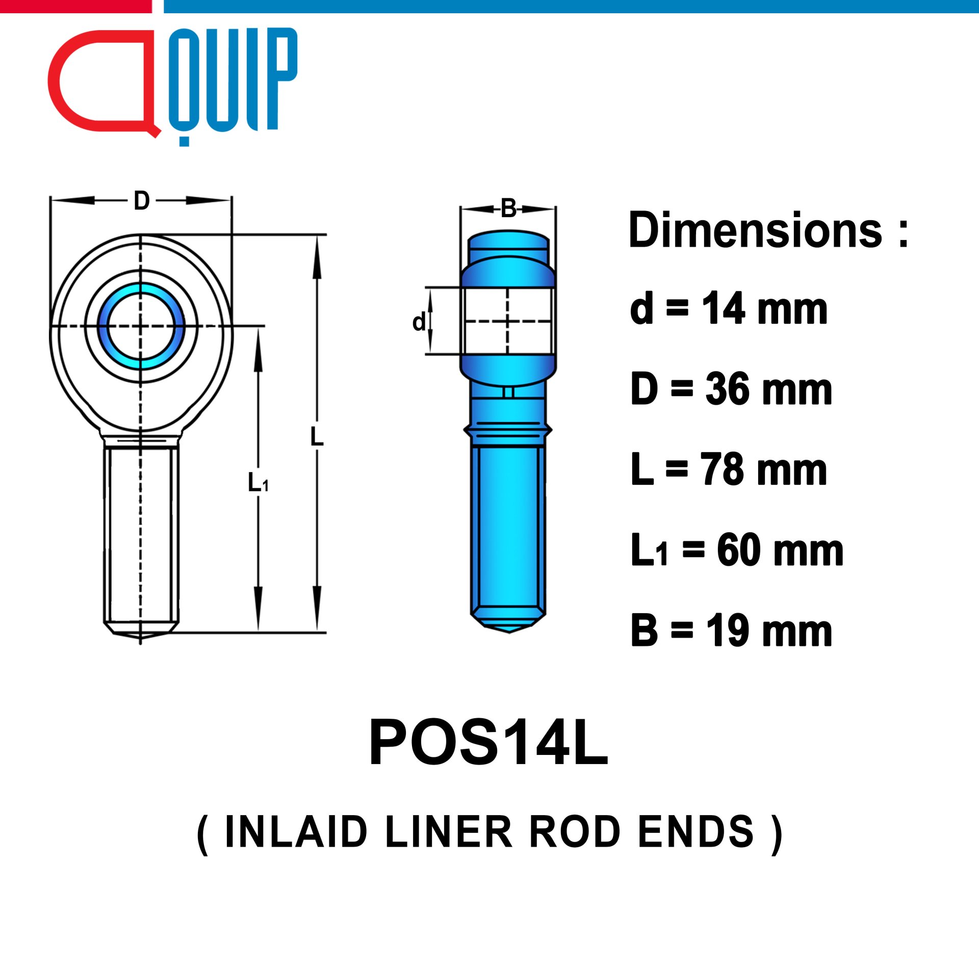 ตลับลูกปืนตาเหลือก เบอร์ POS14LINLAID LINER ROD ENDS ตลับลูกปืนตาเหลือก / ลูกหมากคันชัก ตัวผู้ เกลียวซ้ายSpecifications d : 14 mm D : 36 mm L : 78 mm L1 : 60 mm B : 19 mm S : M14x2 mm