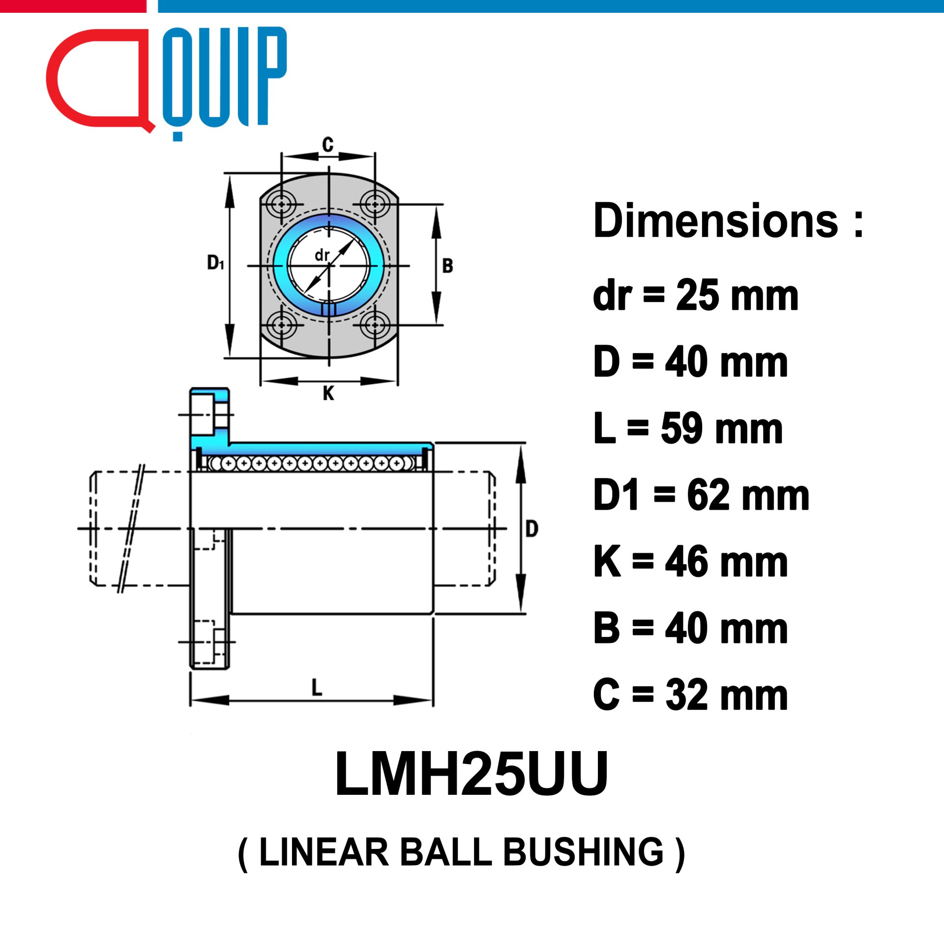 Specifications ขนาดของรูใน ID (dr) : 25 mm ขนาดของวงนอก OD (D) : 40 mm ขนาดของหน้าแปลน (D1) : 62 mm ขนาดของหน้าแปลน (K) : 46 mm ความยาว Width (L) : 59 mm