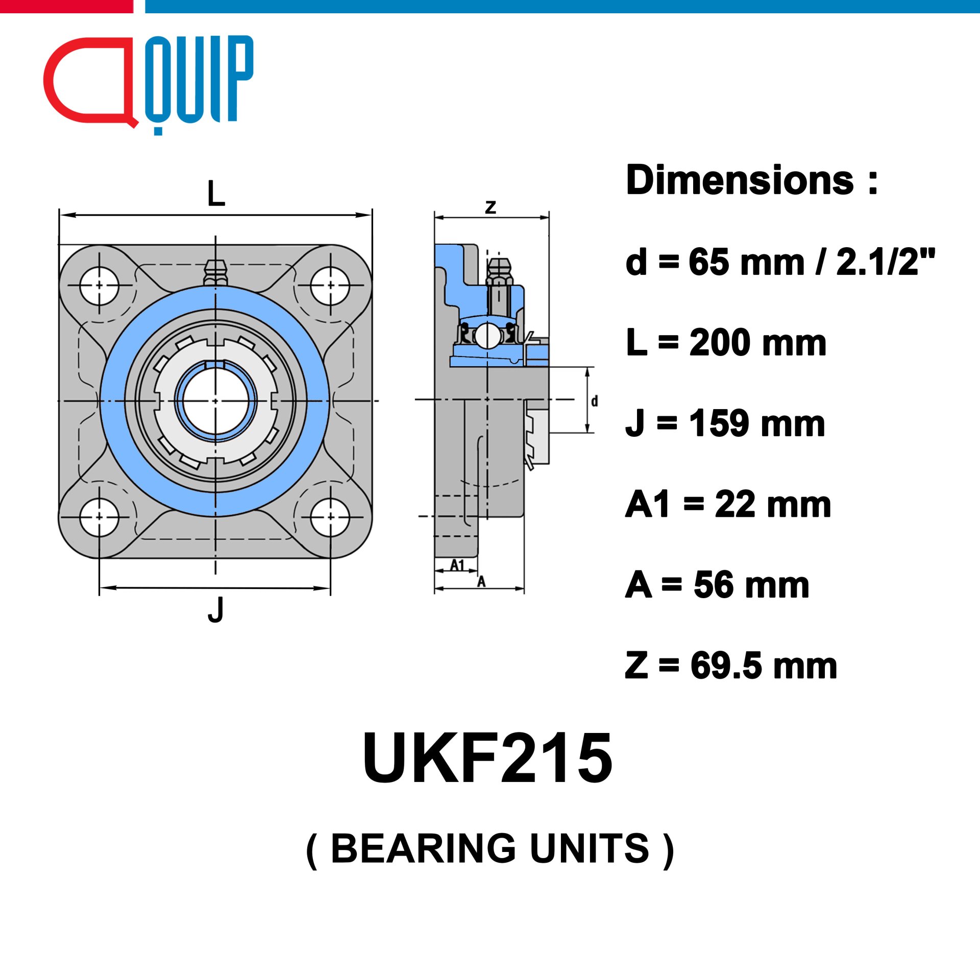 ตลับลูกปืนตุ๊กตา เบอร์ UKF215Bearing Units ตลับลูกปืนตุ๊กตา (ลูก+เสื้อ) UK215 + F215Specifications : d : 65 mm / 2.1/2" L : 200 mm J : 159 mm A1 : 22 mm A : 56 mm Z : 69.5 mm