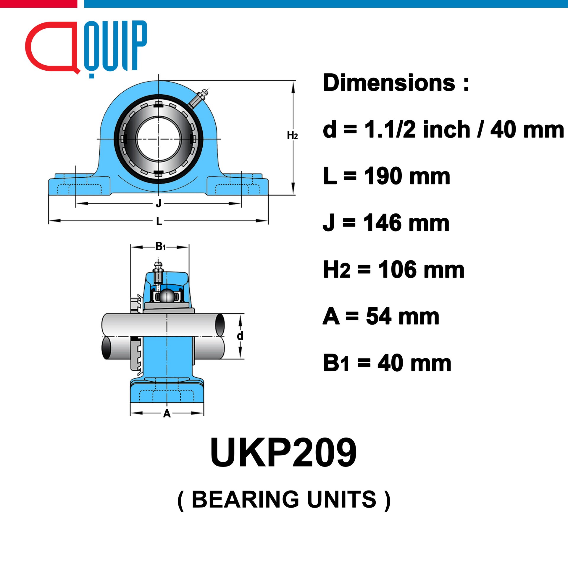 ตลับลูกปืนตุ๊กตา เบอร์ UKP209Bearing Units ตลับลูกปืนตุ๊กตา (ลูก+เสื้อ) UK209 + P209Specifications : d : 40 mm / 1.1/2" L : 190 mm J : 146 mm H2 : 106 mm A : 54 mm B1 : 50 mm