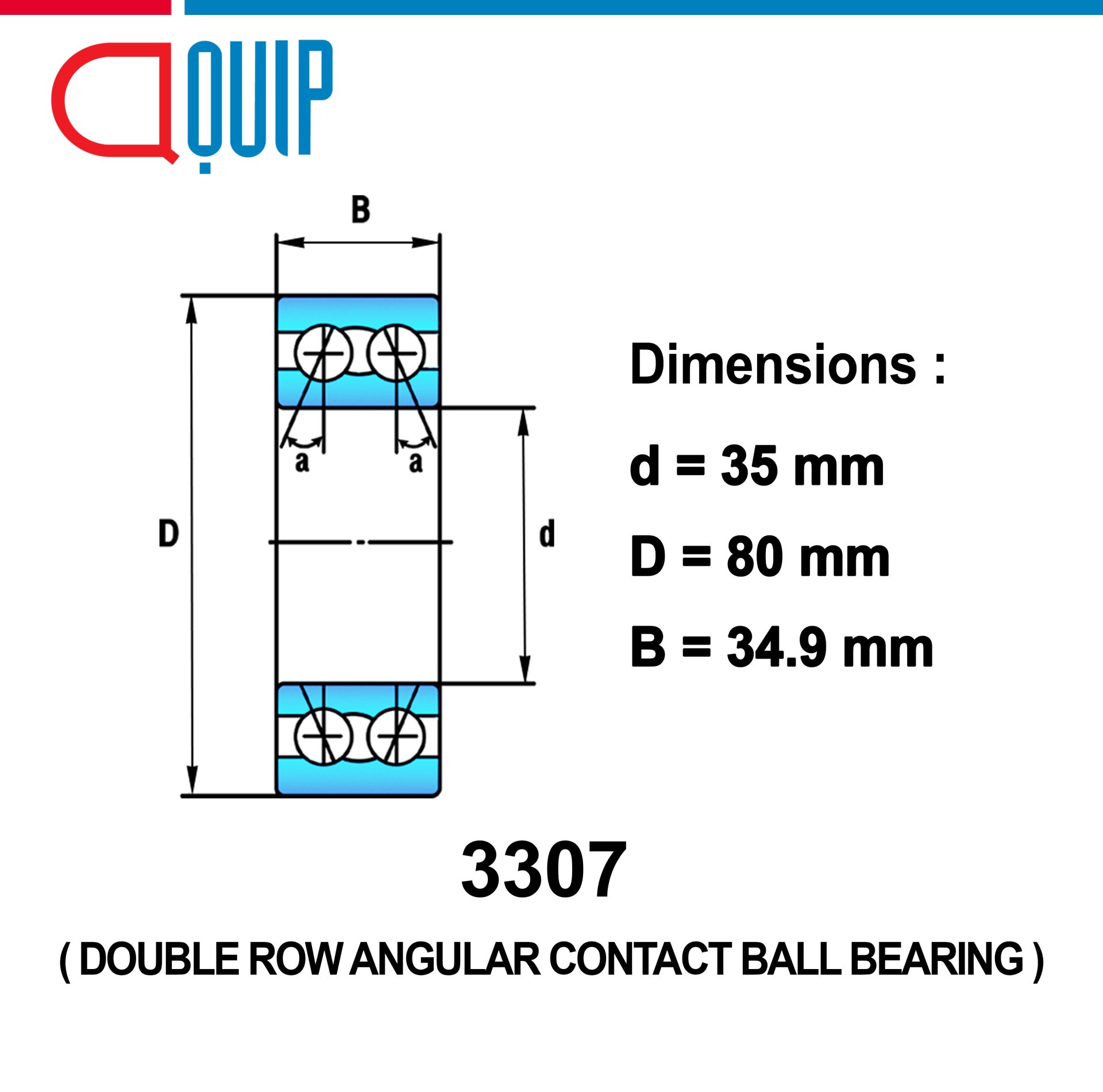 ตลับลูกปืน สัมผัสเชิงมุม 2 แถว เบอร์ 3307 DOUBLE ROW ANGULAR CONTACT BALL BEARING ตลับลูกปืนเม็ดกลม สัมผัสเชิงมุม 2 แถวSpecificationsขนาดของรูใน ID (d) : 35 mmขนาดของวงนอก OD (D) : 80 mmความหนา Width (B) : 34.9 mm