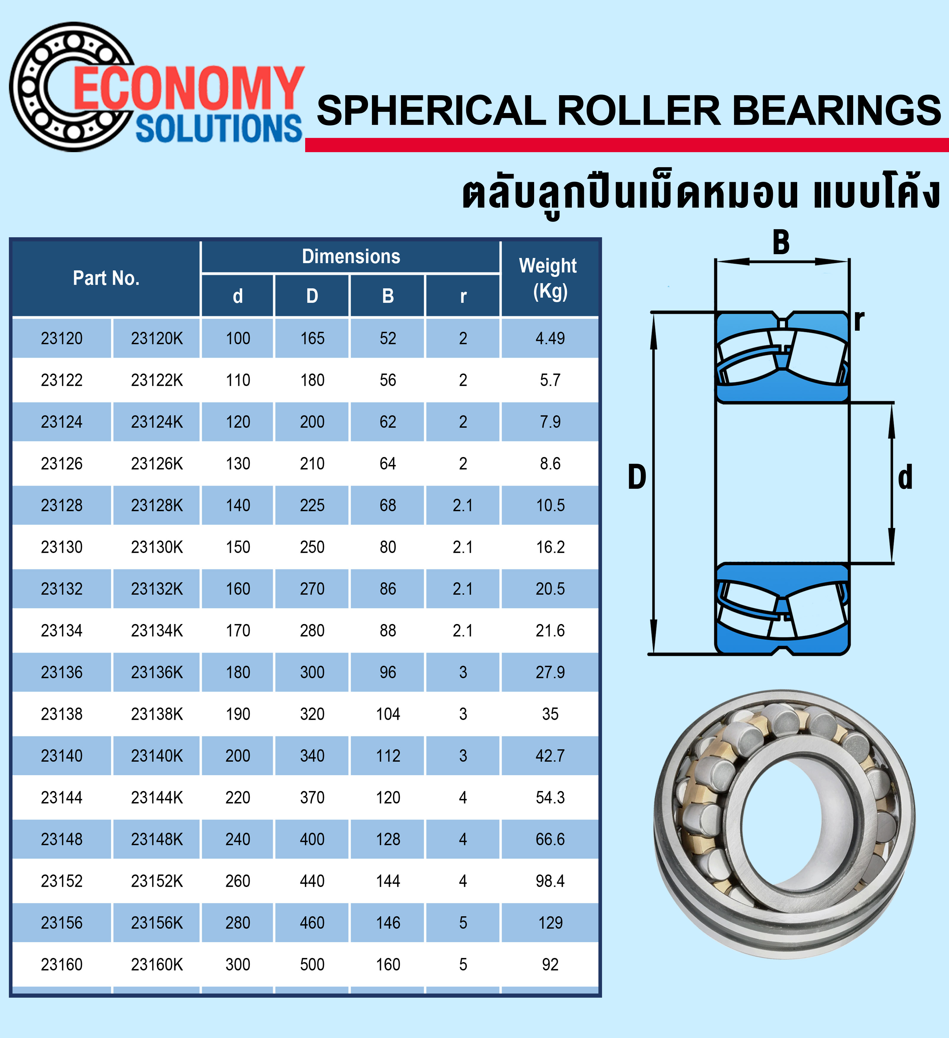 ตลับลูกปืนเม็ดหมอน แบบโค้ง เบอร์ 23120SPHERICAL ROLLER BEARINGS ตลับลูกปืนเม็ดหมอน แบบโค้ง เพลาตรงSpecificationsขนาดของรูใน ID (d) : 100 mmขนาดของวงนอก OD (D) : 165 mmความหนา Width (B) : 52 mm