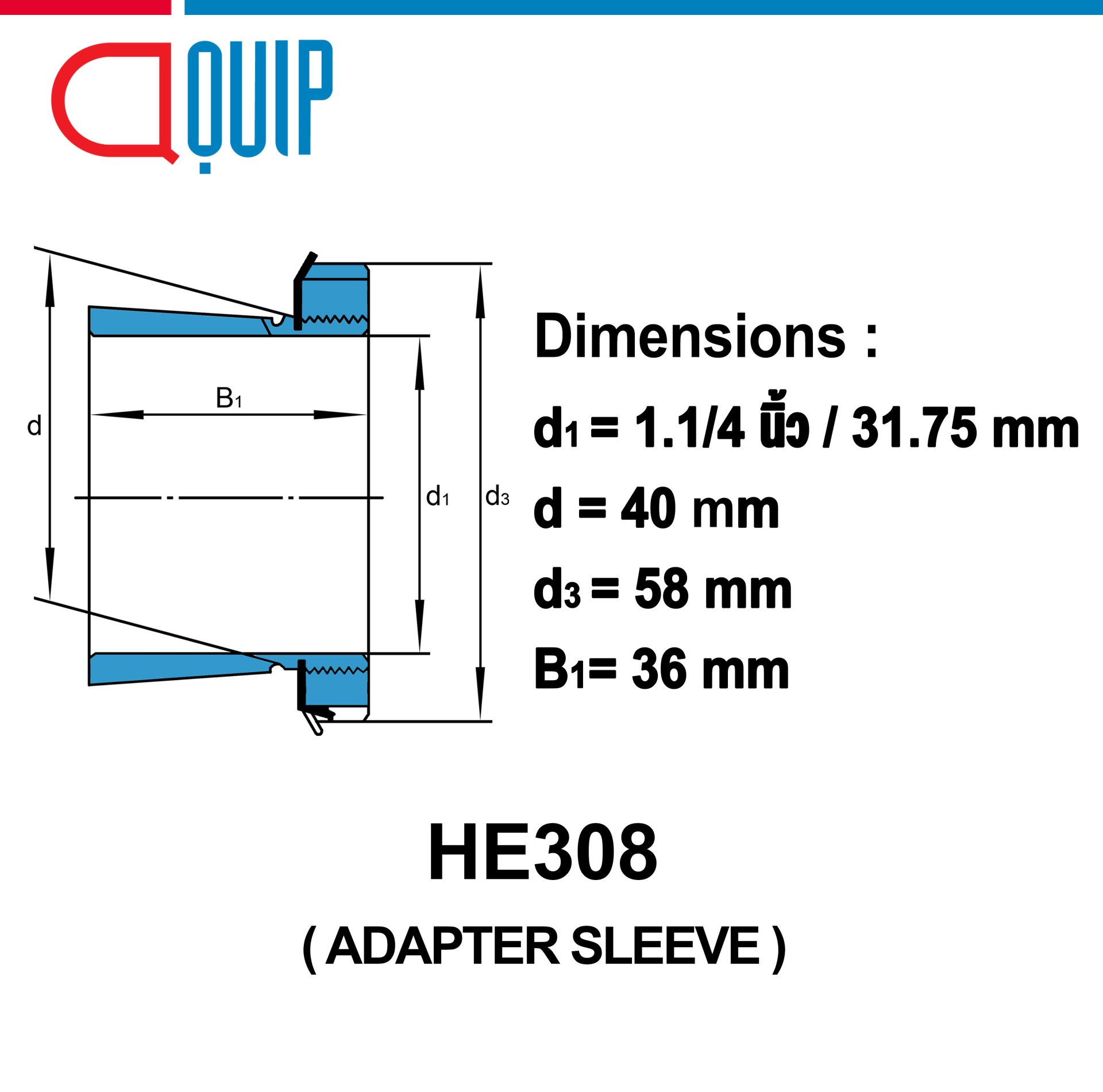 ปลอกรัดเพลา เบอร์ HE308ADAPTER SLEEVE ปลอกรัดเพลา สำหรับเพลานิ้วSpecifications d1 = 1.1/4" หรือ 31.75 mm d = 40 mm d3 = 58 mm B1 = 36 mm