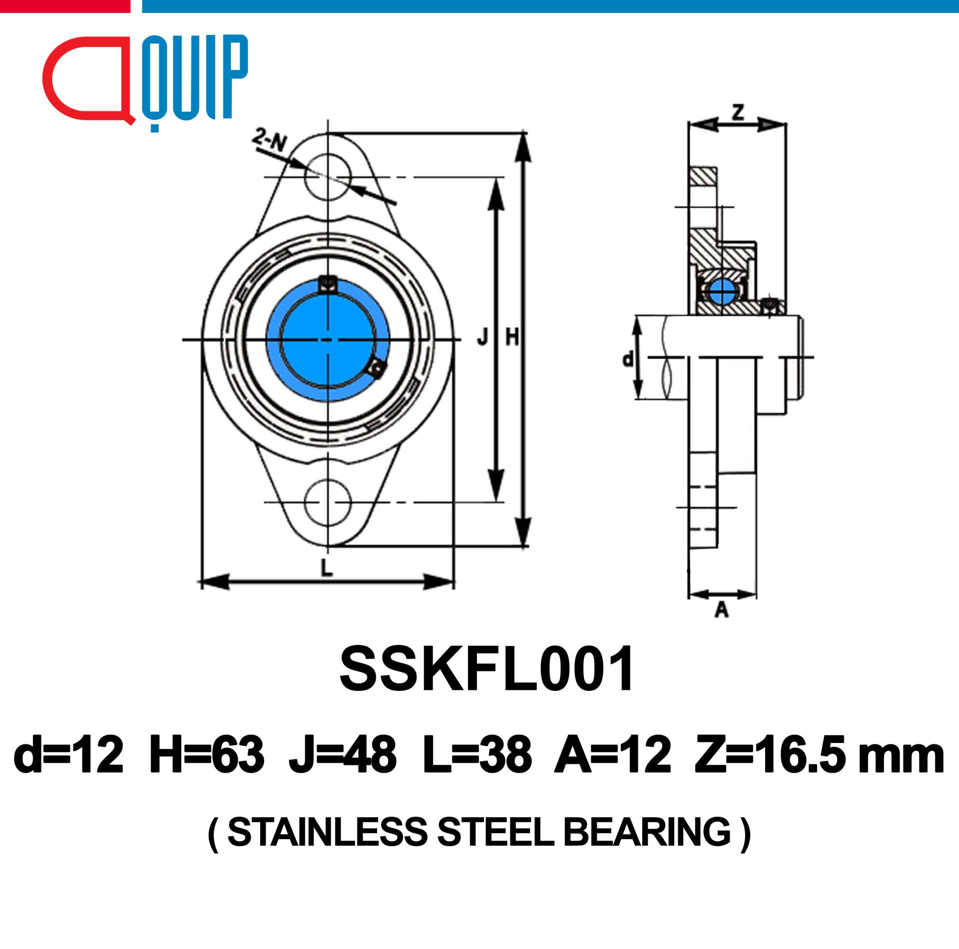 ตลับลูกปืนตุ๊กตา ขนาดเล็ก เบอร์ SSKFL001STAINLESS STEEL FLANGE BEARING UNITS ตลับลูกปืนตุ๊กตา สเตนแลส ขนาดเล็กSpecifications d = 12 mm H = 63 mm J = 48 mm L = 38 mm A = 12 mm Z = 16.5 mm