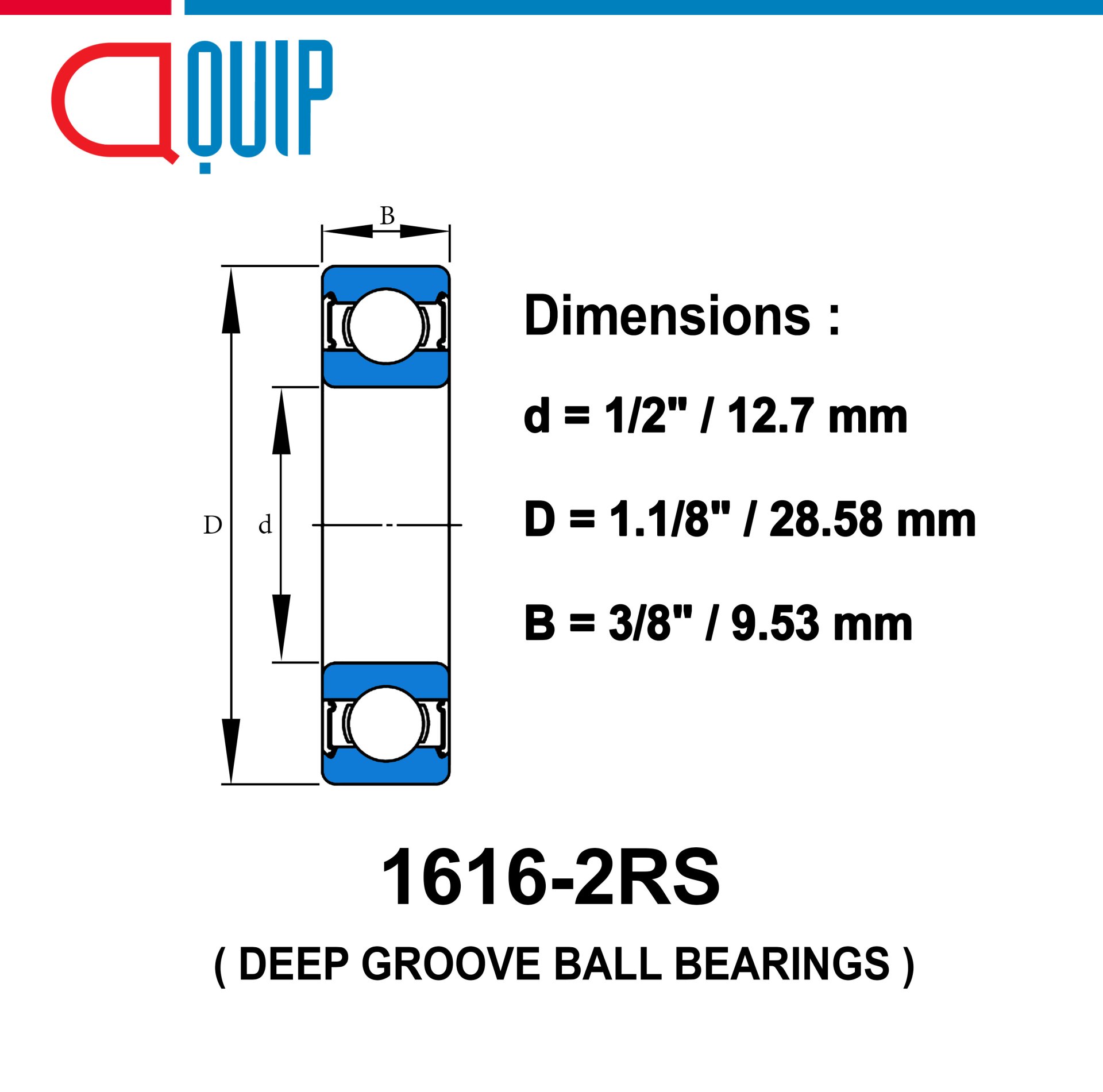 ตลับลูกปืน เม็ดกลม เบอร์ 1616-2RSDEEP GROOVE BALL BEARING ตลับลูกปืนเม็ดกลม ร่องลึกSpecificationsขนาดของรูใน ID (d) : 1/2" หรือ 12.7 mmขนาดของวงนอก OD (D) : 1.1/8" หรือ 28.58 mmความหนา Width (B) : 3/8" หรือ 9.53 mmวัสดุ : แบบฝายางทั้งสองด้าน