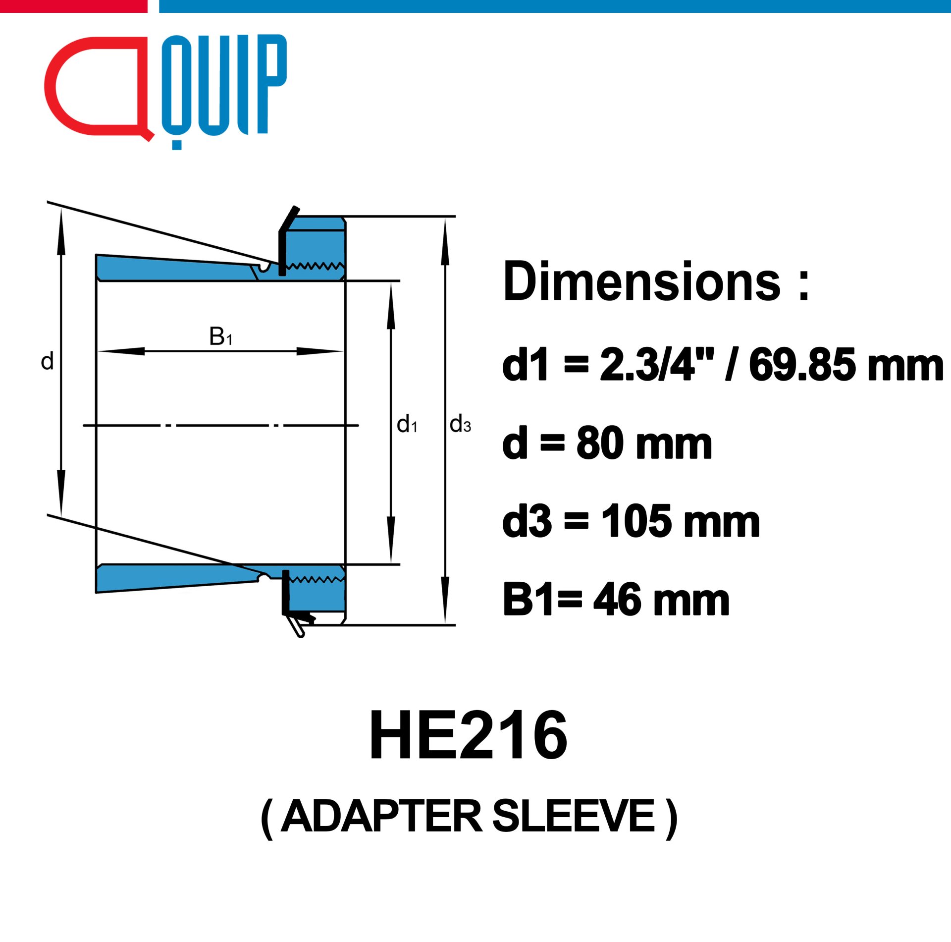 ADAPTER SLEEVE เบอร์ HE216ADAPTER SLEEVE ปลอกรัดเพลา สำหรับเพลานิ้วSpecifications d1 = 2.3/4" หรือ 69.85 mm d = 80 mm d3 = 105 mm B1 = 46 mm