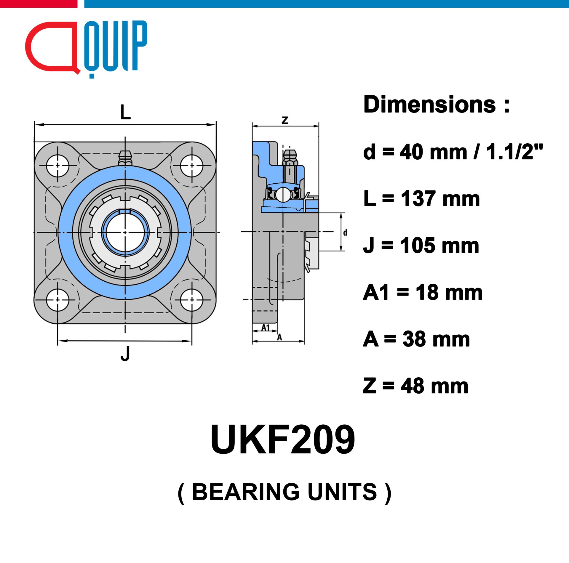 ตลับลูกปืนตุ๊กตา เบอร์ UKF209Bearing Units ตลับลูกปืนตุ๊กตา (ลูก+เสื้อ) UK209 + F209Specifications : d : 40 mm / 1.1/2" L : 137 mm J : 105 mm A1 : 18 mm A : 38 mm Z : 48 mm