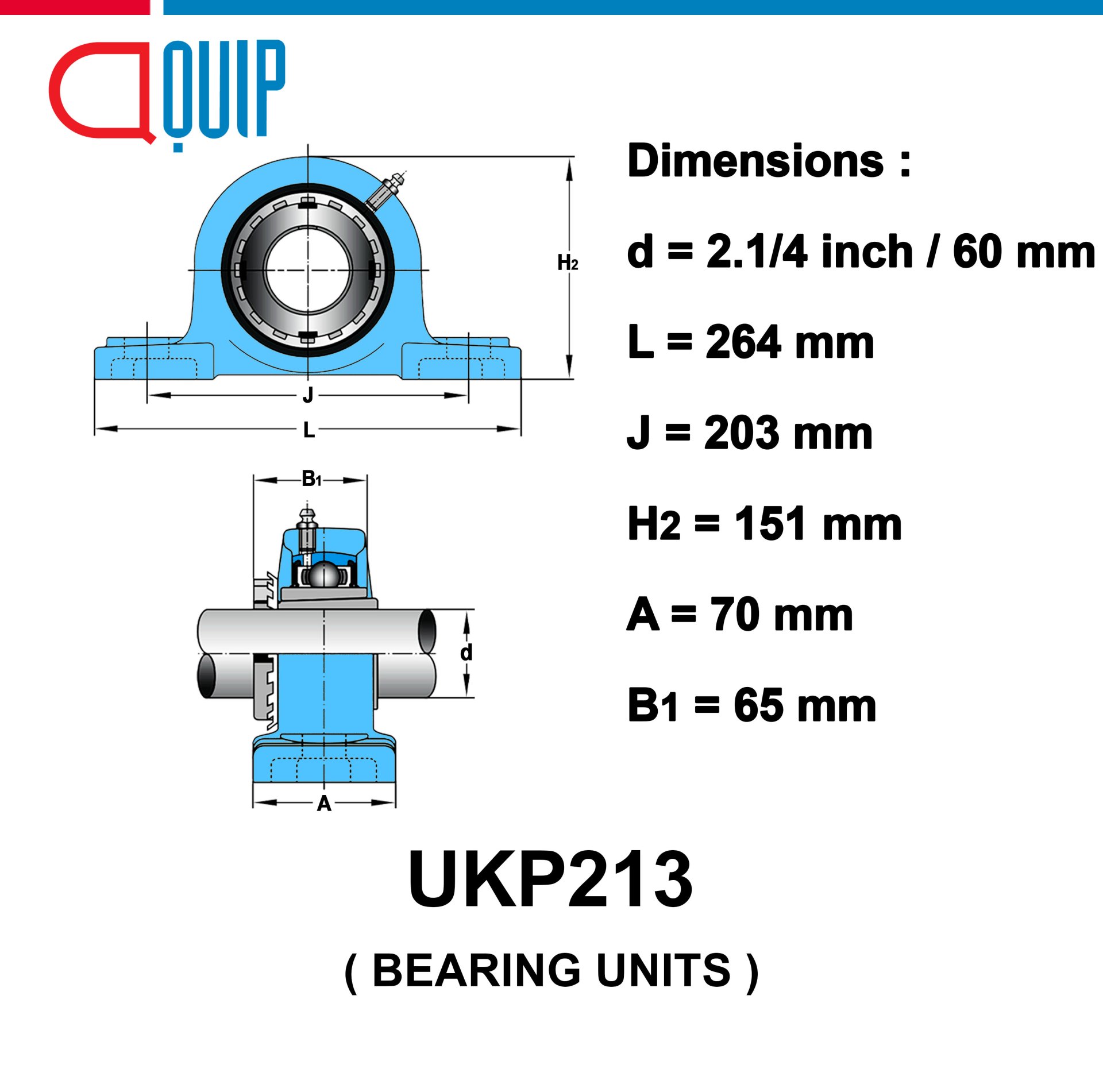 ตลับลูกปืนตุ๊กตา เบอร์ UKP213Bearing Units ตลับลูกปืนตุ๊กตา (ลูก+เสื้อ) UK213 + P213Specifications : d : 60 mm / 2.1/4" L : 264 mm J : 203 mm H2 : 151 mm A : 70 mm B1 : 65 mm